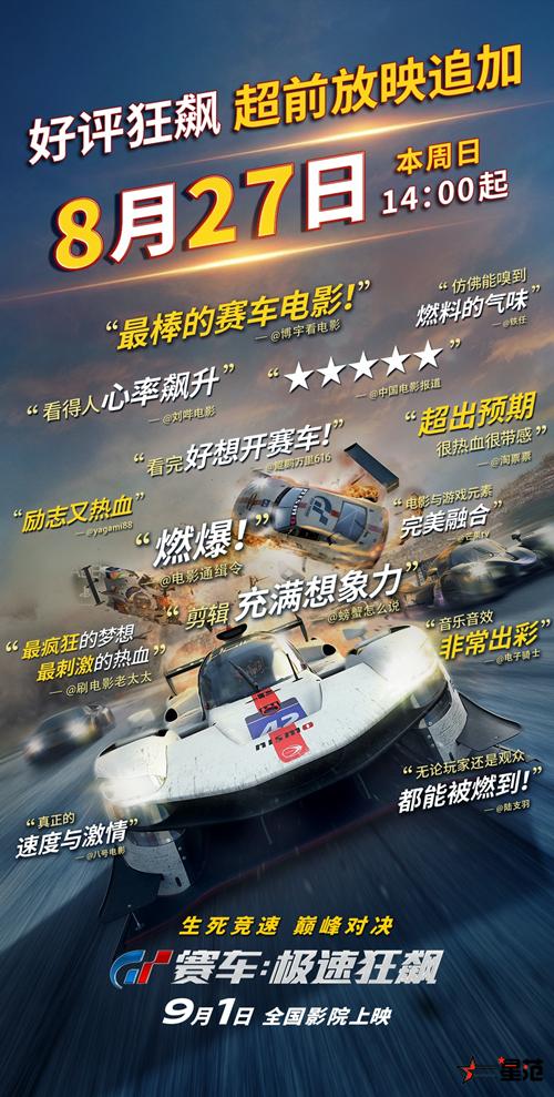 《GT赛车:极速狂飙》全国预售已经开启,在上周末结束的全国40城超前观影活动中,影片口碑持续飙高,本周日(8月27日)也将追加举办超前观影活动,欢迎购票抢占绝佳“观赛”位置。国内媒体大V和广大观众好评认证:“很燃很热血”、“看得人心率狂飙”、“最棒的赛车电影”。影迷、赛车迷、游戏迷们看完后激情安利“影片消除了观众和影像之间的次元壁,让观众走入电影”、“就算不是赛车观众,也必然能感受到片中赛车飙速带来的刺激与快感”。